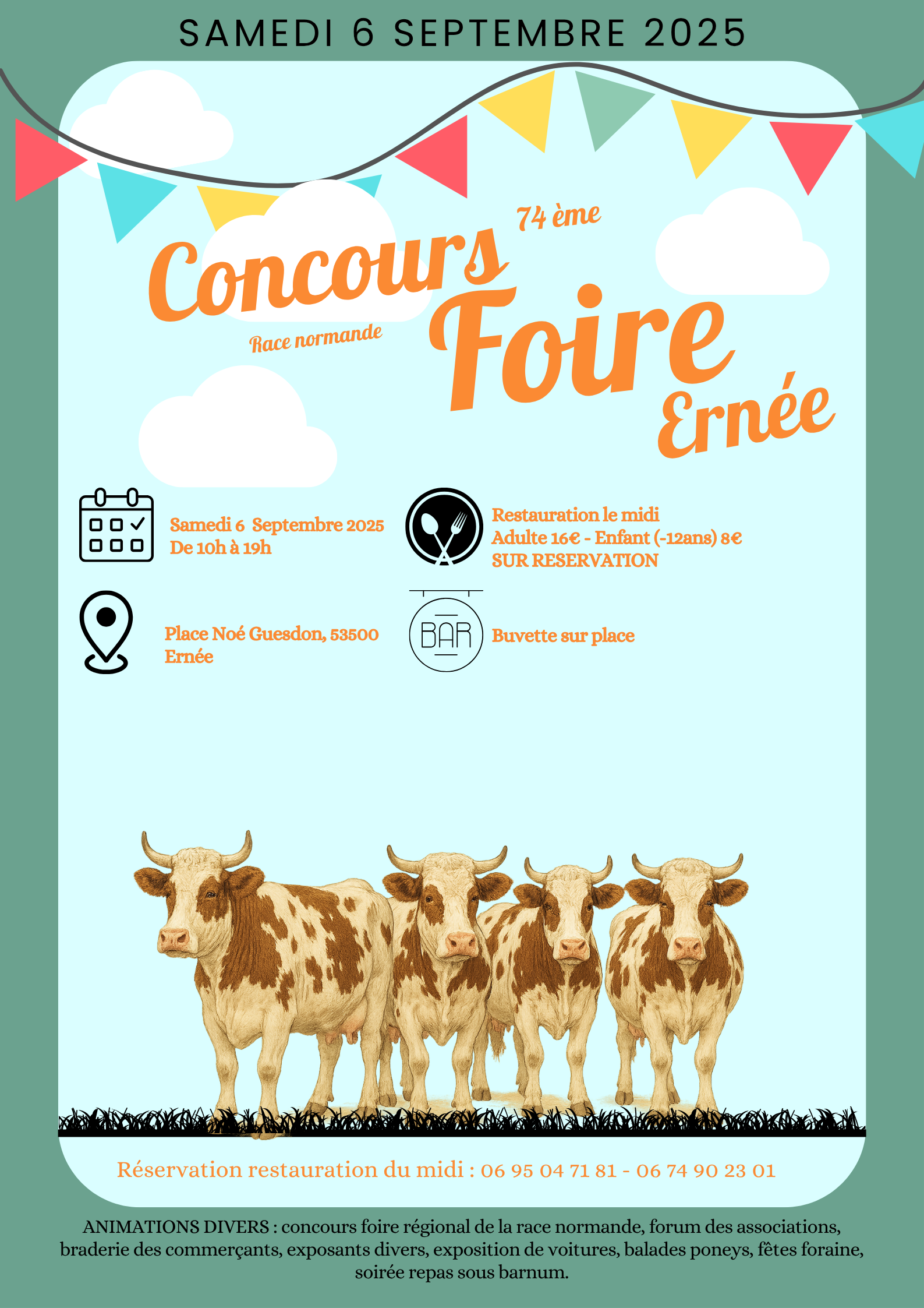 –74 ème Concours foire race bovine normandeAnnulé pour des raisons sanitaires et par précaution. Concours de percherons. Exposition de matériel agricole.