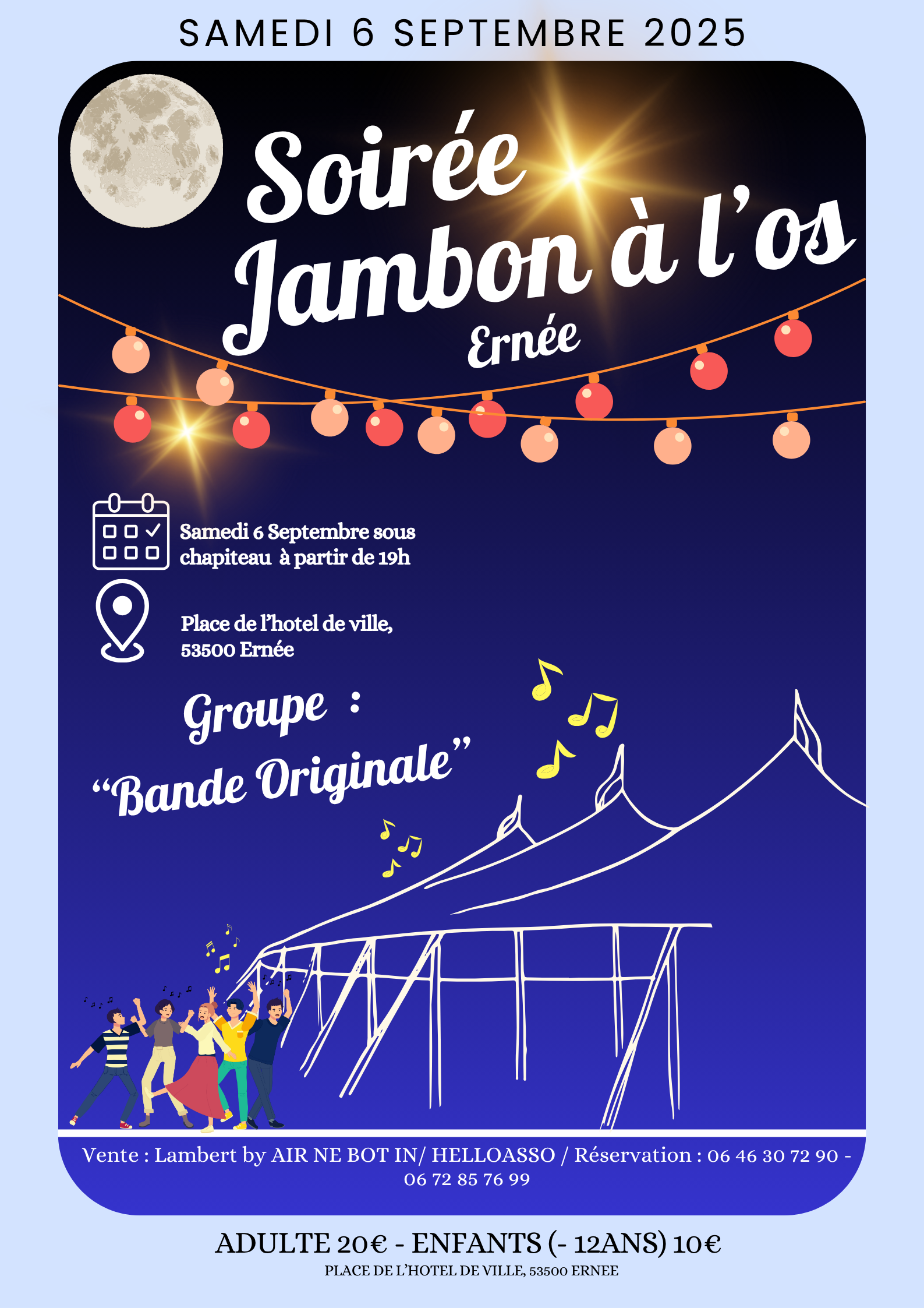 Adulte 16 € – Enfant – 12 ans : 8 € Réservation : 06 95 04 71 81 / 06 74 90 23 01 – Adulte 16 € – Enfant – 12 ans : 8 € Réservation : 06 95 04 71 81 / 06 74 90 23 01 - Soirée Jambon à l’os sous chapiteau