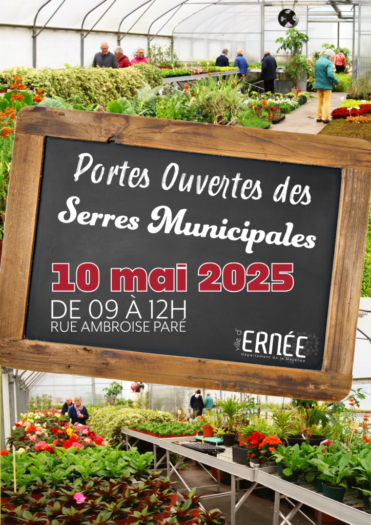 Portes Ouvertes des serres municipales Samedi 10 mai De 09h à 12h Rue Ambroise Paré Visite des serres municipales de la ville d’Ernée … Venez découvrir nos plantes et les conseils de nos agents municipaux ! Partager :