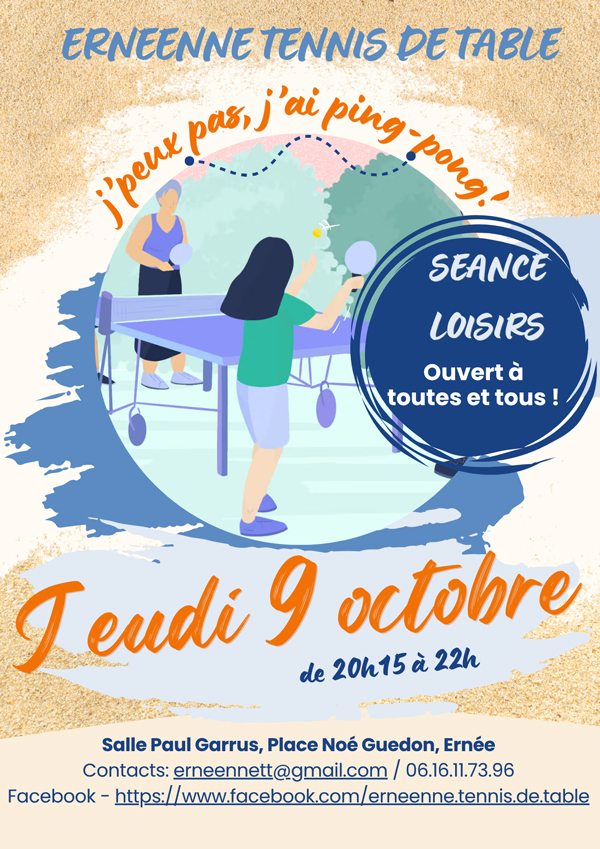 Venez partager un moment convivial avec l’Ernéenne Tennis de Table, améliorer votre technique ou simplement vous amuser.