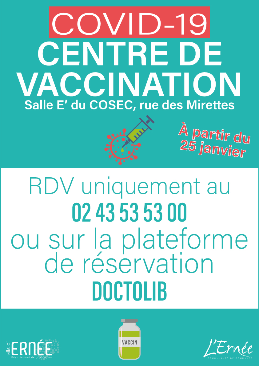 RDV uniquement au 02 43 53 53 00 ou sur la plateforme de réservation DOCTOLIB (La mairie ne gère pas les réservations)