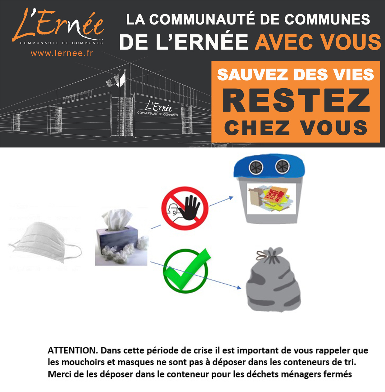 Dans cette période de crise, il est important de vous rappeler que les mouchoirs et masques ne sont pas à déposer dans les conteneurs de tri.