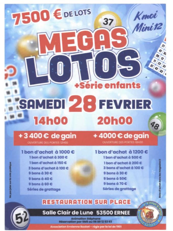 Méga Loto Le Méga loto de l’Ernéenne Basket se déroulera le samedi 28 février 2026. 14h & 20hEspace Clair de Lune Buvette et restauration sur place Animation : Stéphane Réservation : par SMS ou 06 89 12 53 63 Partager :