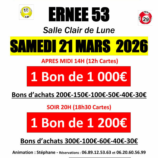- à 20h – Ouverture des portes à 18h30 – 1 bon de 1200€ – Bons d’achats 300€-100€-60€-40€-30€