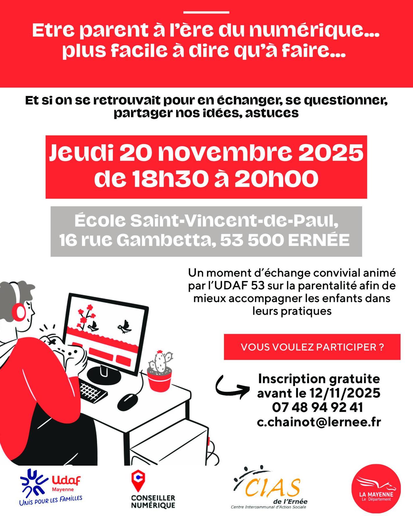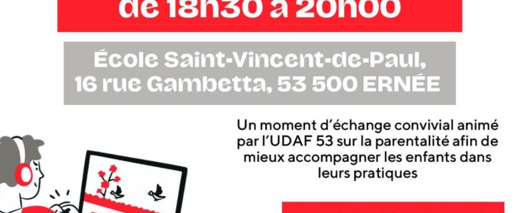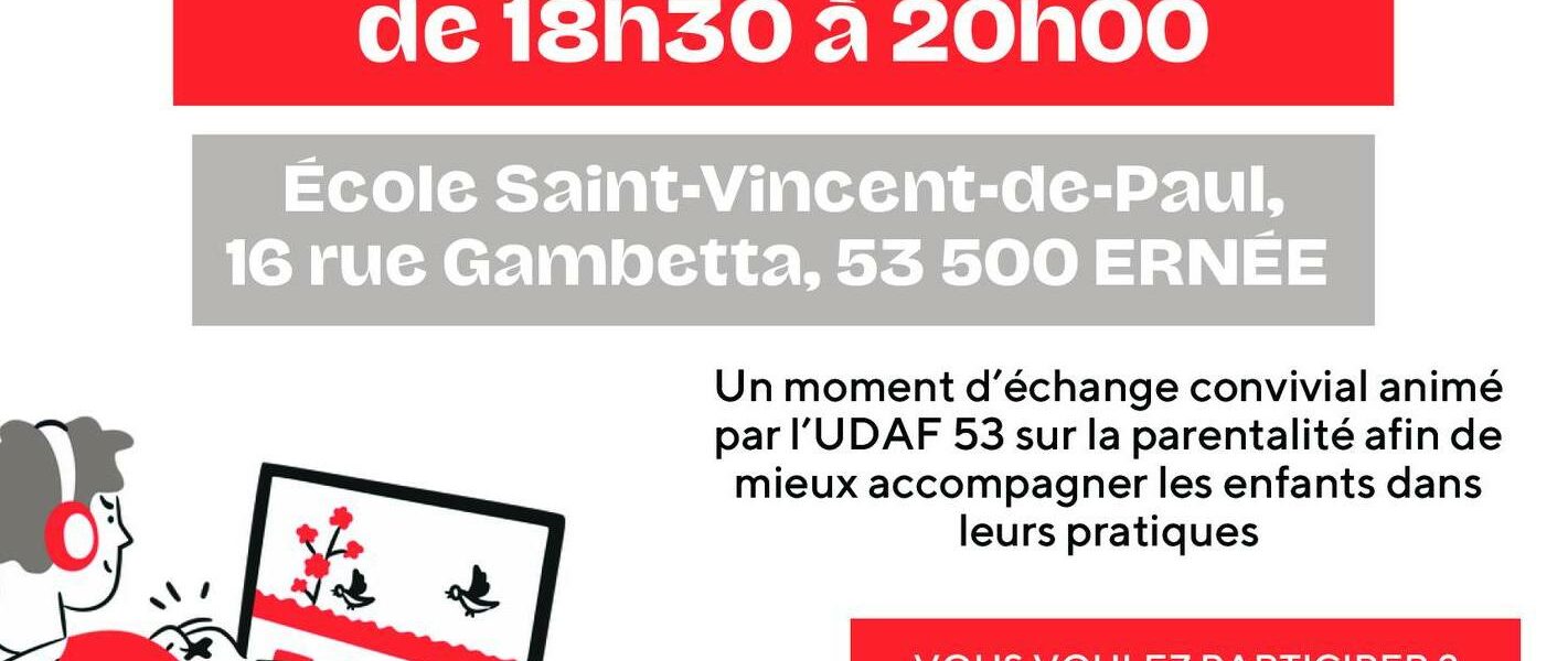 Dans ce cadre, un café-parents est organisé à l’Ecole Saint-Vincent-de-Paul (16 rue Gambetta, 53 500 Ernée), le jeudi 20 novembre 2025 de 18h30 à 20h.