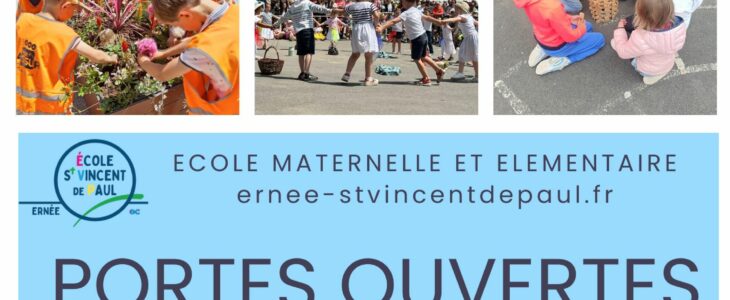 L’école maternelle et élémentaire Saint Vincent de Paul d’Ernée ouvre ses portes le samedi 14 mars 2026 entre 9h30 et 12h30. Vous pourrez visiter les locaux scolaires et périscolaires (garderie, cantine) et rencontrer l’ensemble de l’équipe pédagogique ainsi que les parents membres des associations partenaires (APEL et OGEC).