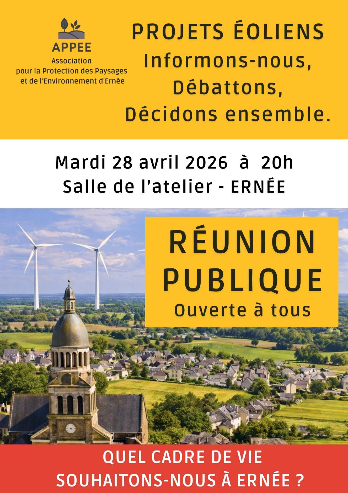 Réunion publique APPEE Mardi 28 avril 2026 20h Salle de l’Atelier Réunion publique ouverte à tous. Projets éoliens : quel cadre de vie souhaitons nous à Ernée ? Organisée par l’APPEE. Partager :