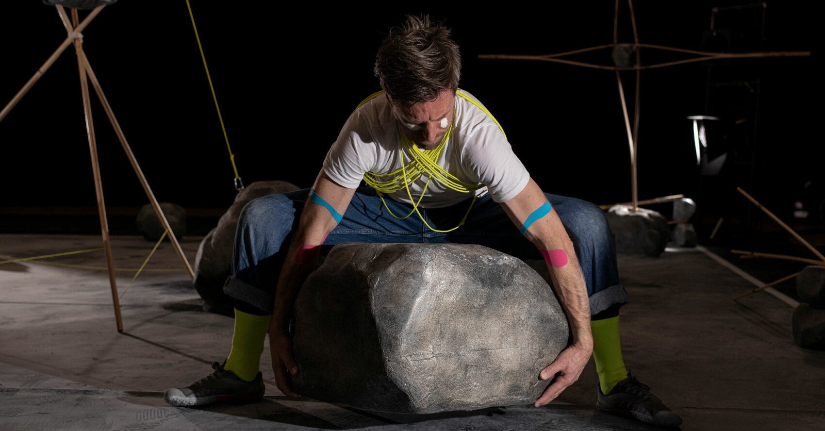 nouage c’est un spectacle qui nous entraine dans les curieuses pérégrinations d’un homme affairé. Il déplace, entasse, empile de petits et gros cailloux. Pour qui, pourquoi, on ne sait pas. Ce qui est sûr c’est qu’il a l’air bien déterminé. Pour l’instant, sa construction à l’air de tenir. Elle grandit, grandit, grandit. Jusqu’où ? Évidemment, nous n’allons pas vous le dire ici. Il faut venir au spectacle pour le découvrir ! Quelque chose de merveilleux va se fabriquer, entre poésie, danse et sculpture. Une harmonie pour petit·e·s et grand·e·s