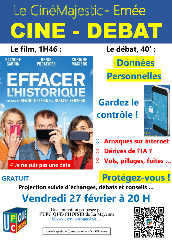 L’UFC Que-Choisir de la Mayenne vous convie à un ciné-débat, le vendredi 27 février à 20 H, au Majestic d’Ernée sur la protection de nos données personnelles.