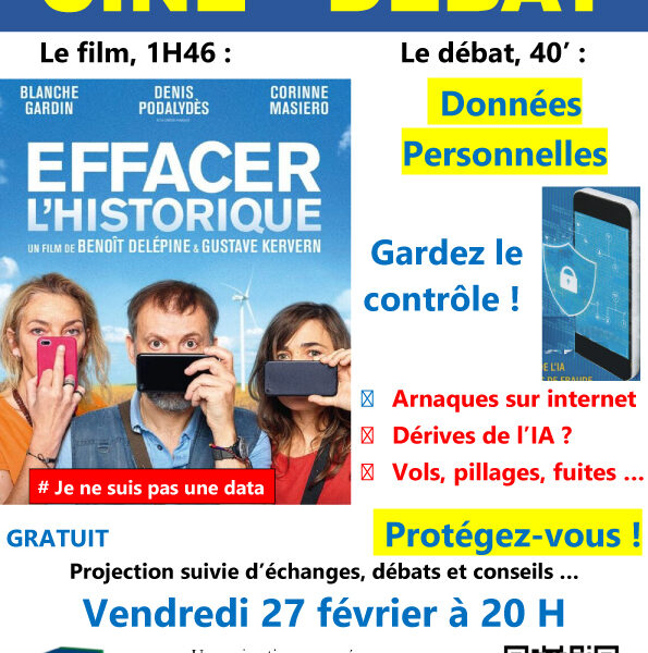 Le débat sera précédé de la diffusion du film « Effacer l’historique », une comédie française à la fois « hilarante et désespérée sur l’absurdité d’une société du numérique – Entrée gratuite !