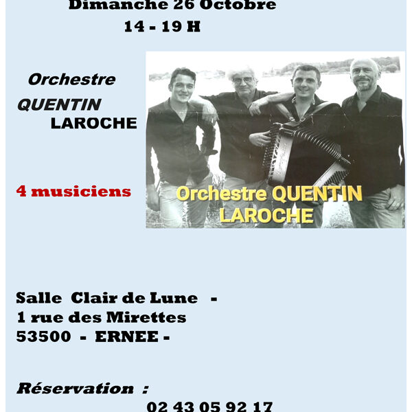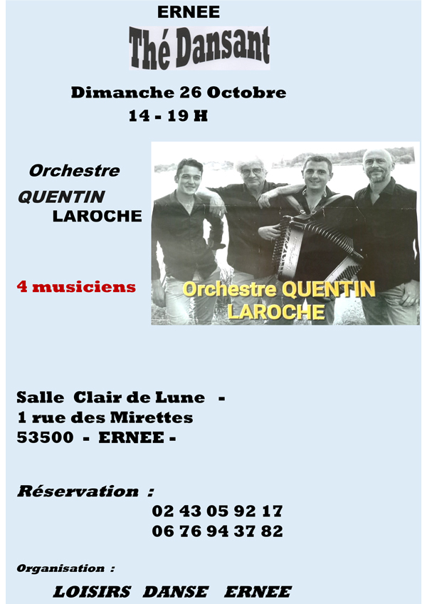Thé dansant L’Association Loisirs Danse d’Ernée organise un thé dansant le dimanche 26 octobre 2025, de 14 à 19 h , animé par l’orchestre de 4 musiciens – QUENTIN LAROCHE. Espace Clair de Lune , 1 rue des mirettes , 53500 ERNEE . Réservation : 02 43 05 92 17 – 06 76 94 37 82 Partager :