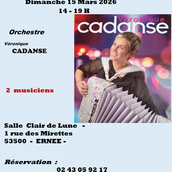 L’association Loisirs Danse d’Ernée organise un thé dansant le dimanche 15 mars prochain, avec l’orchestre Véronique Cadanse (2 musiciens), salle Clair de Lune, 1 rue des Mirettes, 53500 Ernée, de 14 h à 19 h.